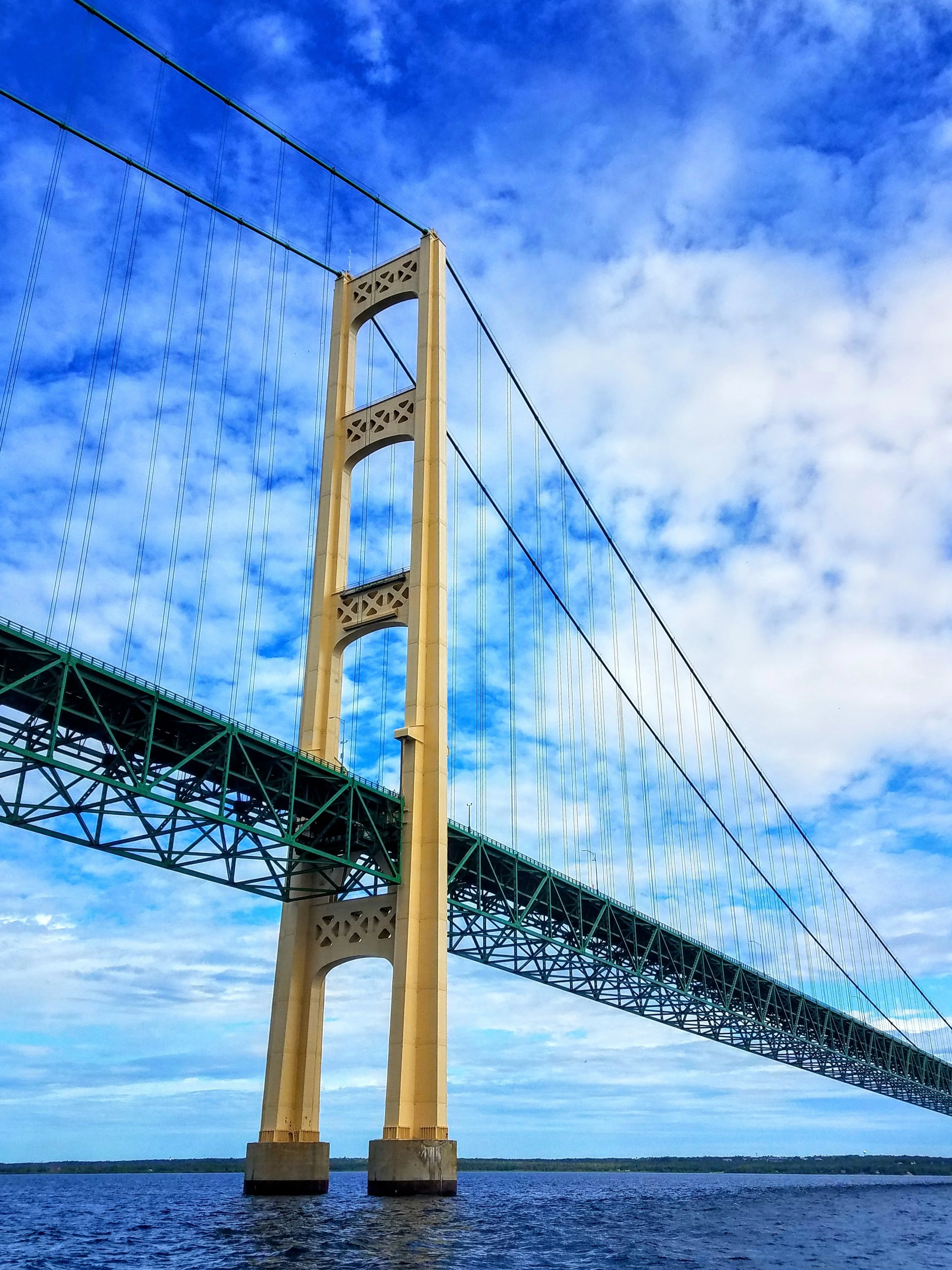 Leaving Mackinac Island heading to Beaver Island. The main towers of the Mackinac Bridge rise more than 550 feet above the Straits of Mackinac. The cables, composed of thousands of strands of wire tightly wrapped together, are anchored in giant concrete blocks, which are 8,614 feet apart.